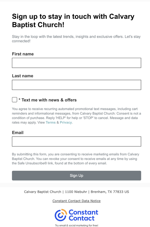 Calvary has recently switched to a different messaging system that is connected to Realm. Please visit this website to subscribe to texts and emails for the updated newsletter and any other news! Thank you!
